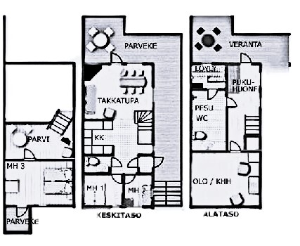 4 makuuhuonetta, olohuone/tupakeittiö, sauna, pesuhuone, kodinhoitohuone, erillinen wc, katetut terassit, parveke sekä erillinen varasto
